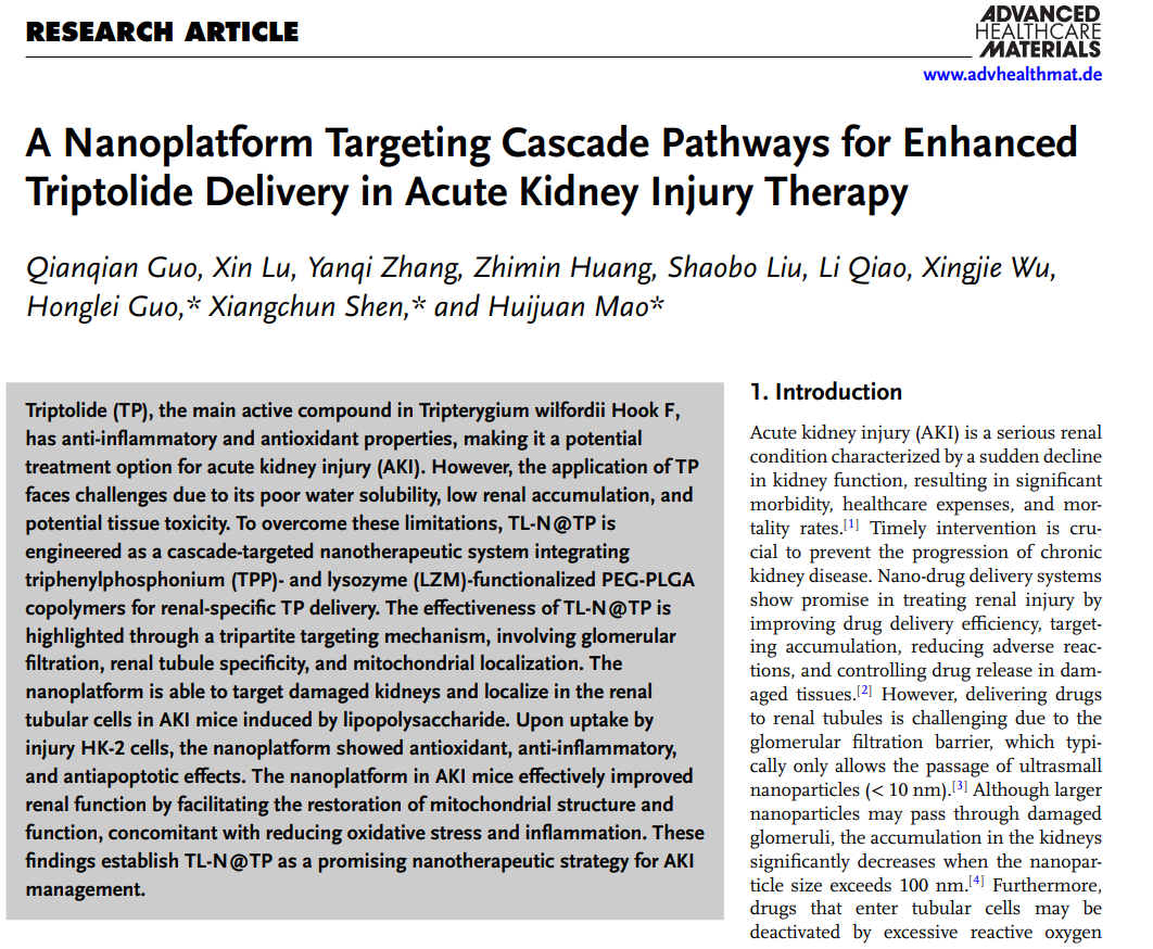 Title: A Nanoplatform Targeting Cascade Pathways for Enhanced Triptolide Delivery in Acute Kidney Injury Therapy