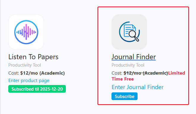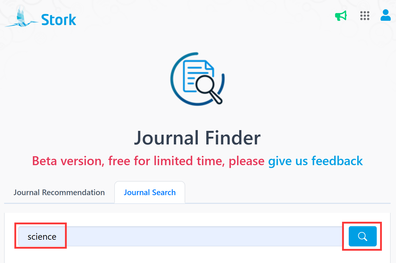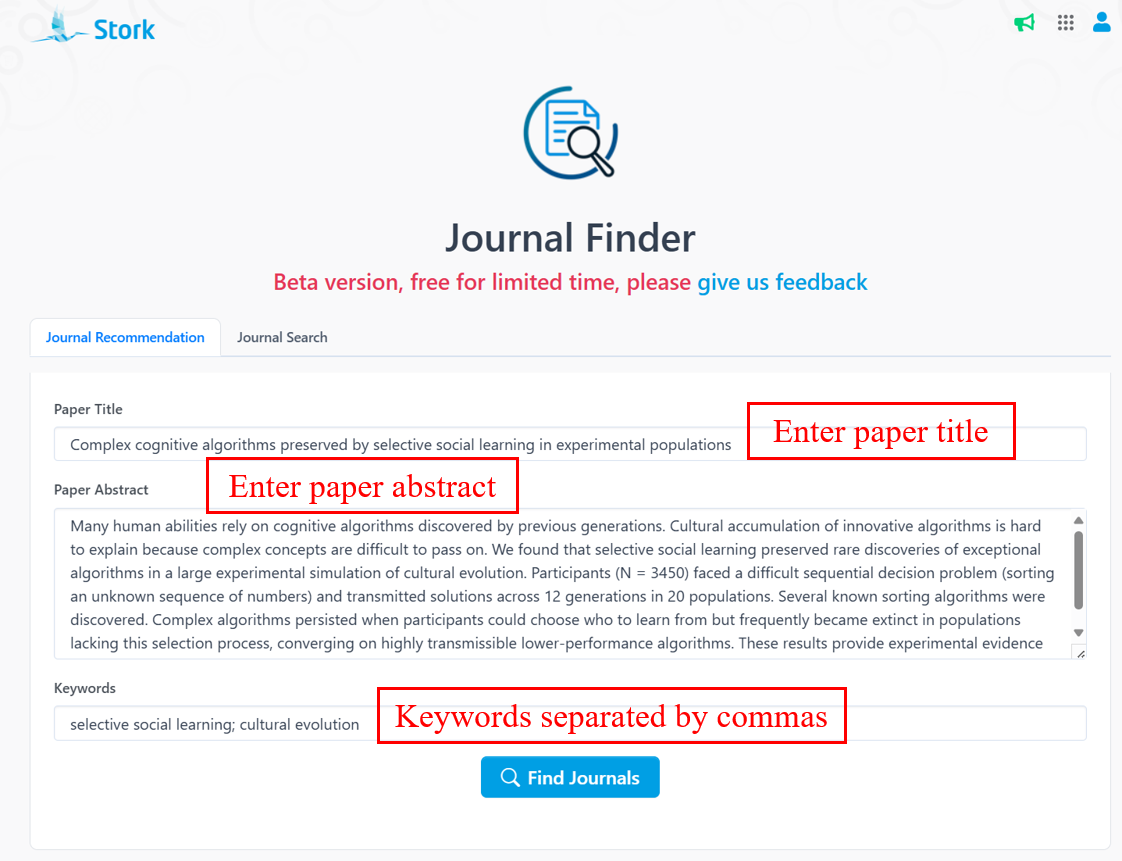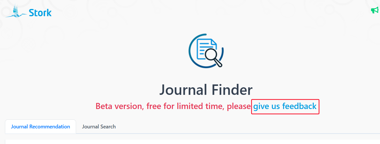 Journal Finder is an advanced feature offered by Stork (free trial is available). After registering/logging into Stork (https://www.storkapp.me), you can find Journal Finder under the "Advanced Feature" section. Then you can try it out or subscribe. Alternatively, you can visit Journal Finder website directly at https://www.storkapp.me/aijournal/.
