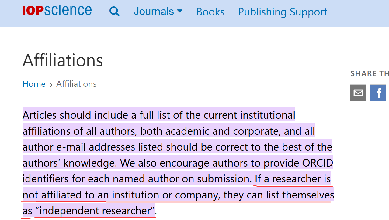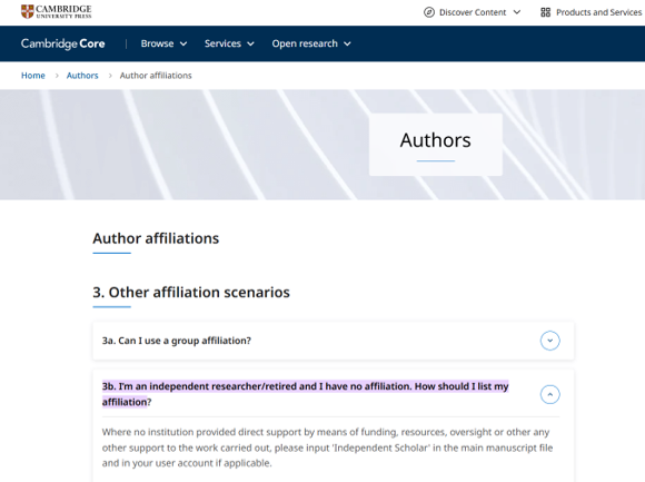 For example, IOP Publishing and Cambridge University Press both explicitly accept "Independent Researcher" or "Independent Scholar" as valid affiliations.