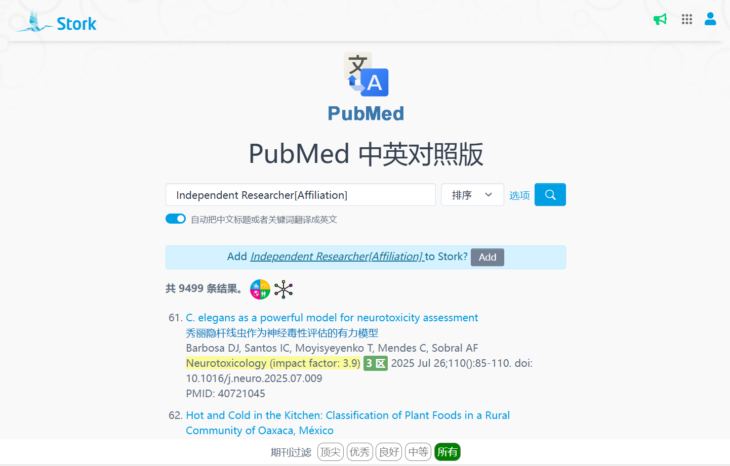 You can find real examples of published papers using this affiliation by searching "Independent Researcher[Affiliation]" in Stork's PubMed Multi-language Search, Translate & Alert. Set your native language, and the results will appear in both English and your chosen language side by side.