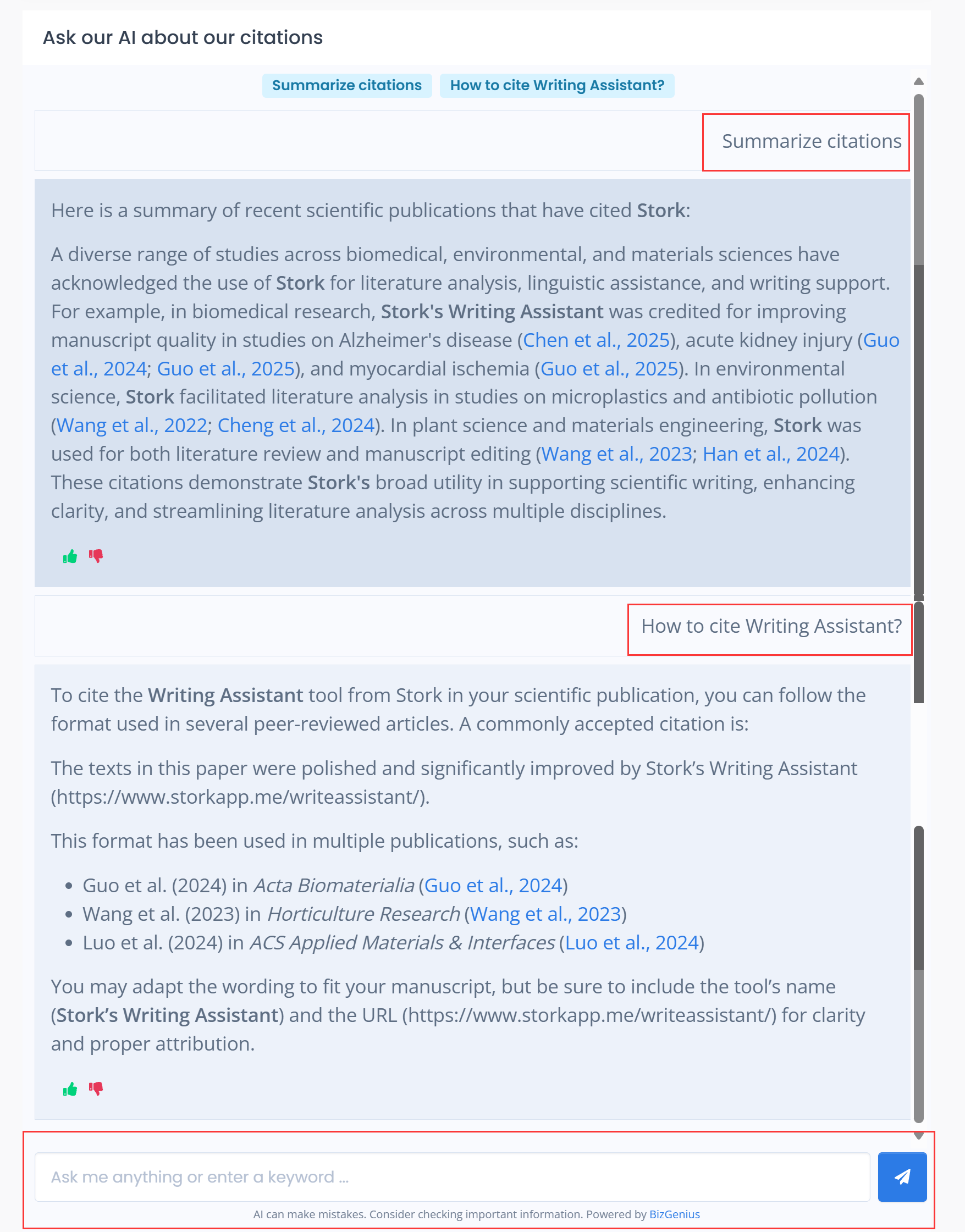 To date, more than 50 scientific papers have cited Stork. If you cite Stork in your paper, please let us know at support@storkapp.me, and we'll offer you a discount based on the journal's impact factor when you subscribe to Writing Assistant or other advanced features.