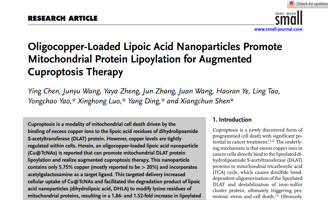 Recently, Ying Chen from The High Efficacy Application of Natural Medicinal Resources Engineering Center of Guizhou Province & School of Pharmaceutical Sciences at Guizhou Medical University in China published a paper titled "Oligocopper-Loaded Lipoic Acid Nanoparticles Promote Mitochondrial Protein Lipoylation for Augmented Cuproptosis Therapy" in the journal Small (IF = 12.1). The paper cited Writing Assistant of Stork. You can access the paper here:https://doi.org/10.1002/smll.202501259