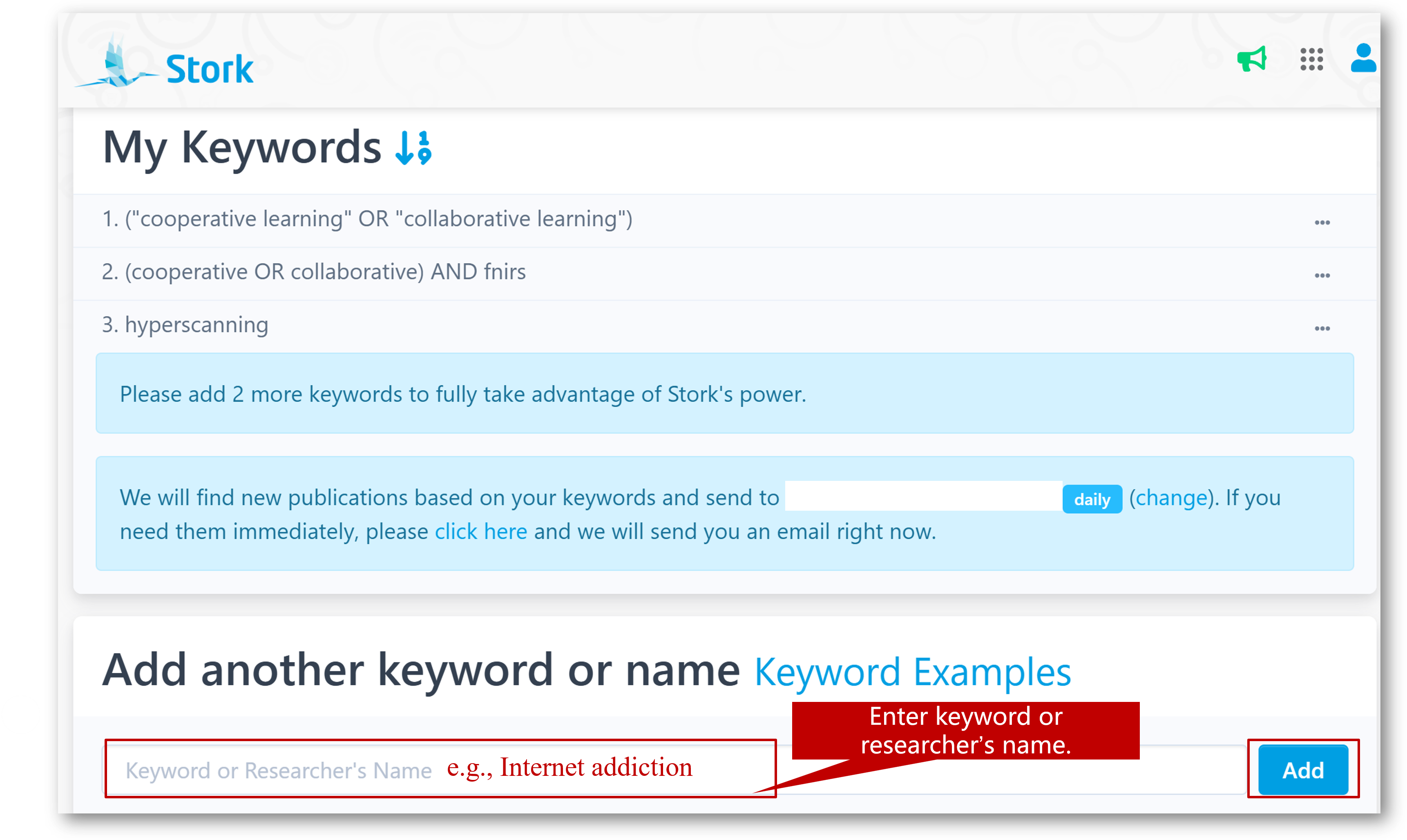 Stork's free feature sends you the latest papers based on your own keywords. To make it easier for you to keep up the latest research, Stork has added: