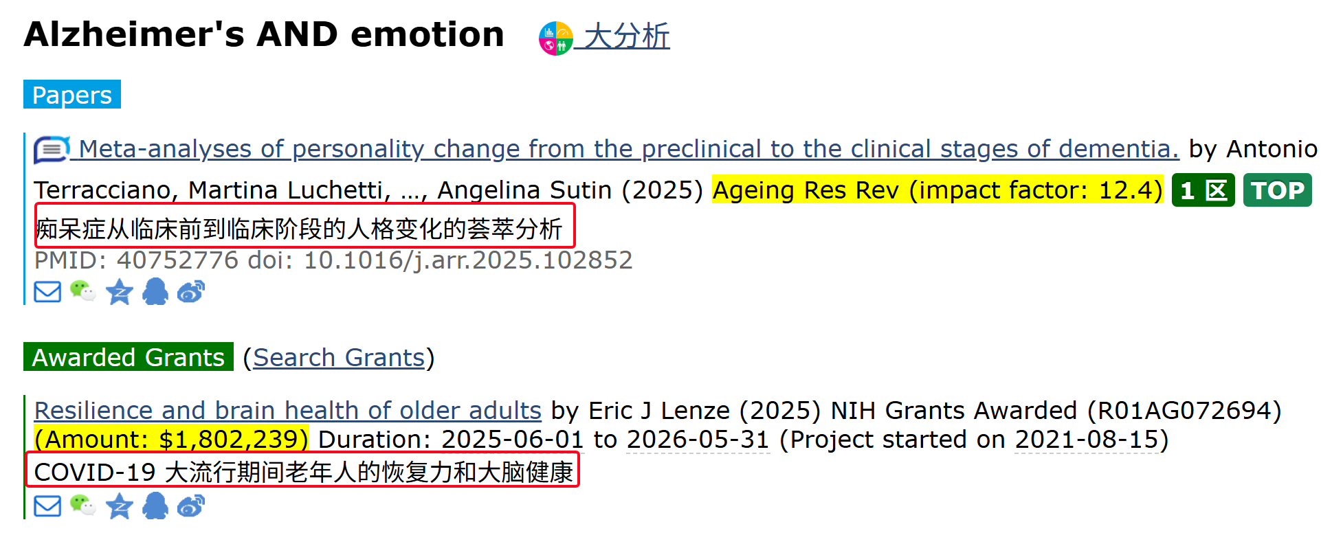 • Big Analysis allows a researcher to quickly understand all aspects of a field's progress in a matter of minutes, including growth trends, geographic distribution, experts (and their contact information), genes, diseases, brain regions, etc.