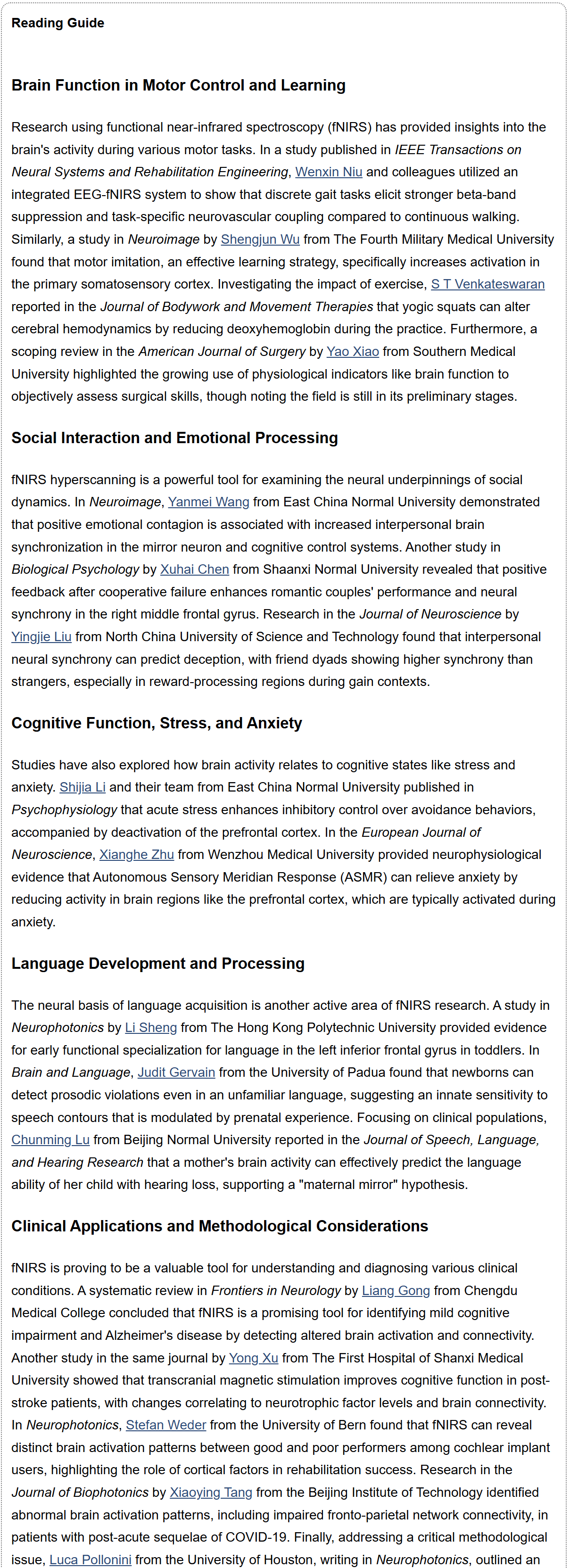 This makes it easy to catch up quickly. You can look across themes to get a sense of the whole field. Or, if you only care about one corner of fNIRS, you can just follow that small theme. Either way, it saves you time and helps you spot the updates that matter most, right when you need them.