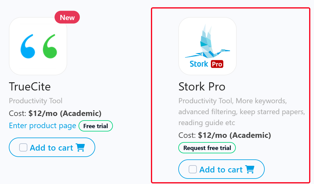 Writing Assistant, Big Analysis, and Citation Network are advanced features offered by Stork (free trial is available). After registering/logging into Stork (https://www.storkapp.me), you can find them under the "Advanced Feature" section. Then you can try it out or subscribe. Alternatively, you can visit Writing Assistant website directly at https://www.storkapp.me/writeassistant/, Big Analysis at  https://www.storkapp.me/meta/, and Citation Network at https://www.storkapp.me/citenet/.