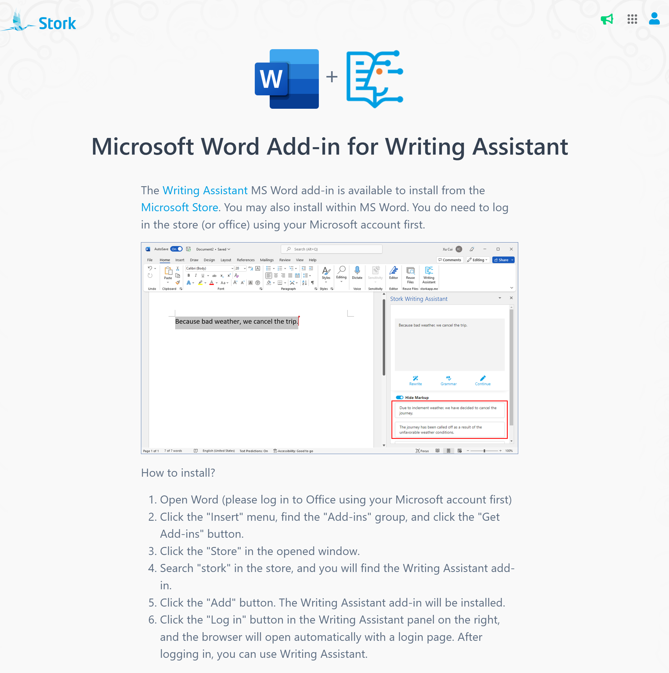 Simply go to Writing Assistant’s official website (https://www.storkapp.me/writeassistant/) and click “Word Add-in” in the top right corner. This will take you to the download page, where you’ll find the installation link, setup instructions, and troubleshooting tips.