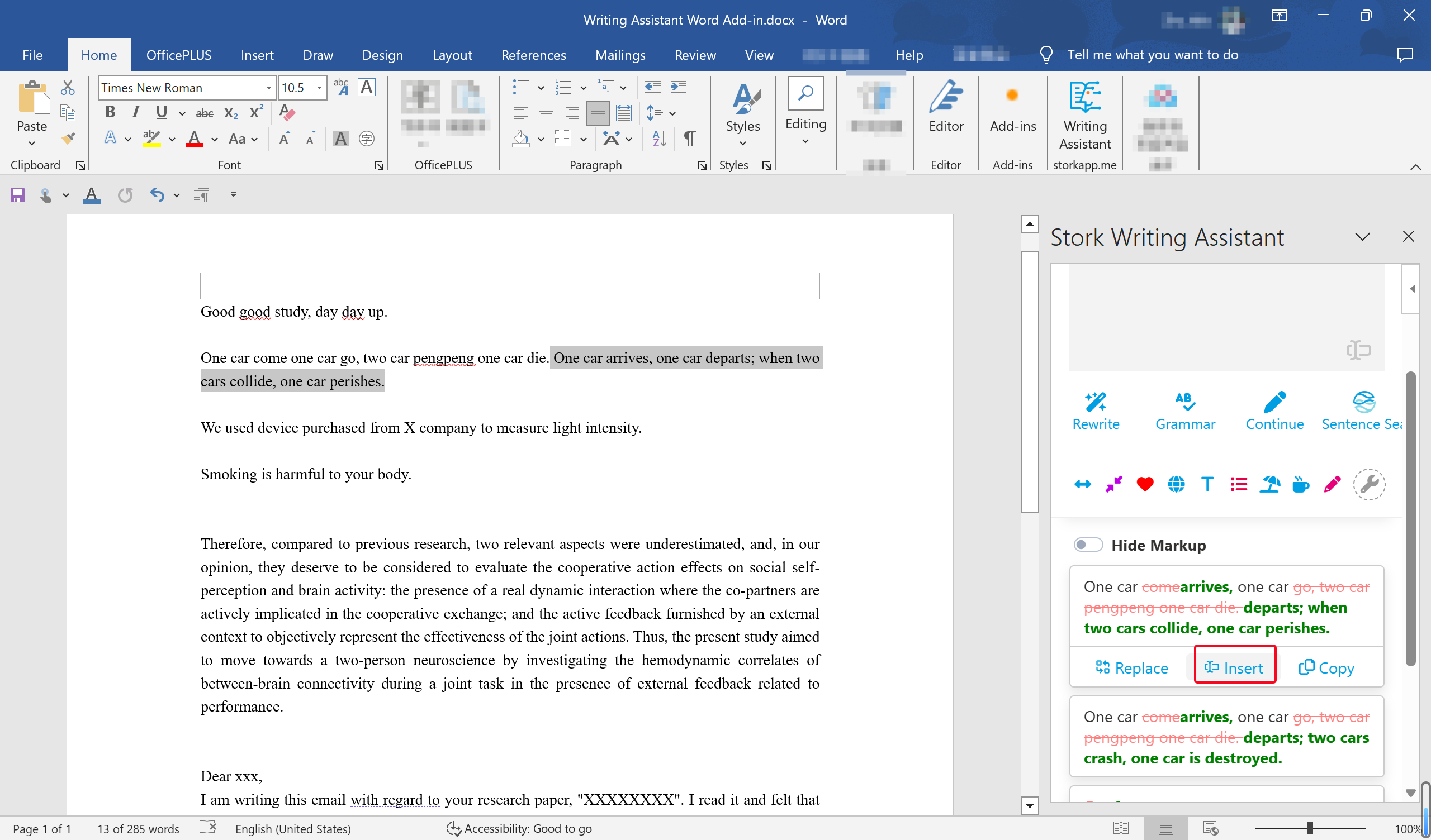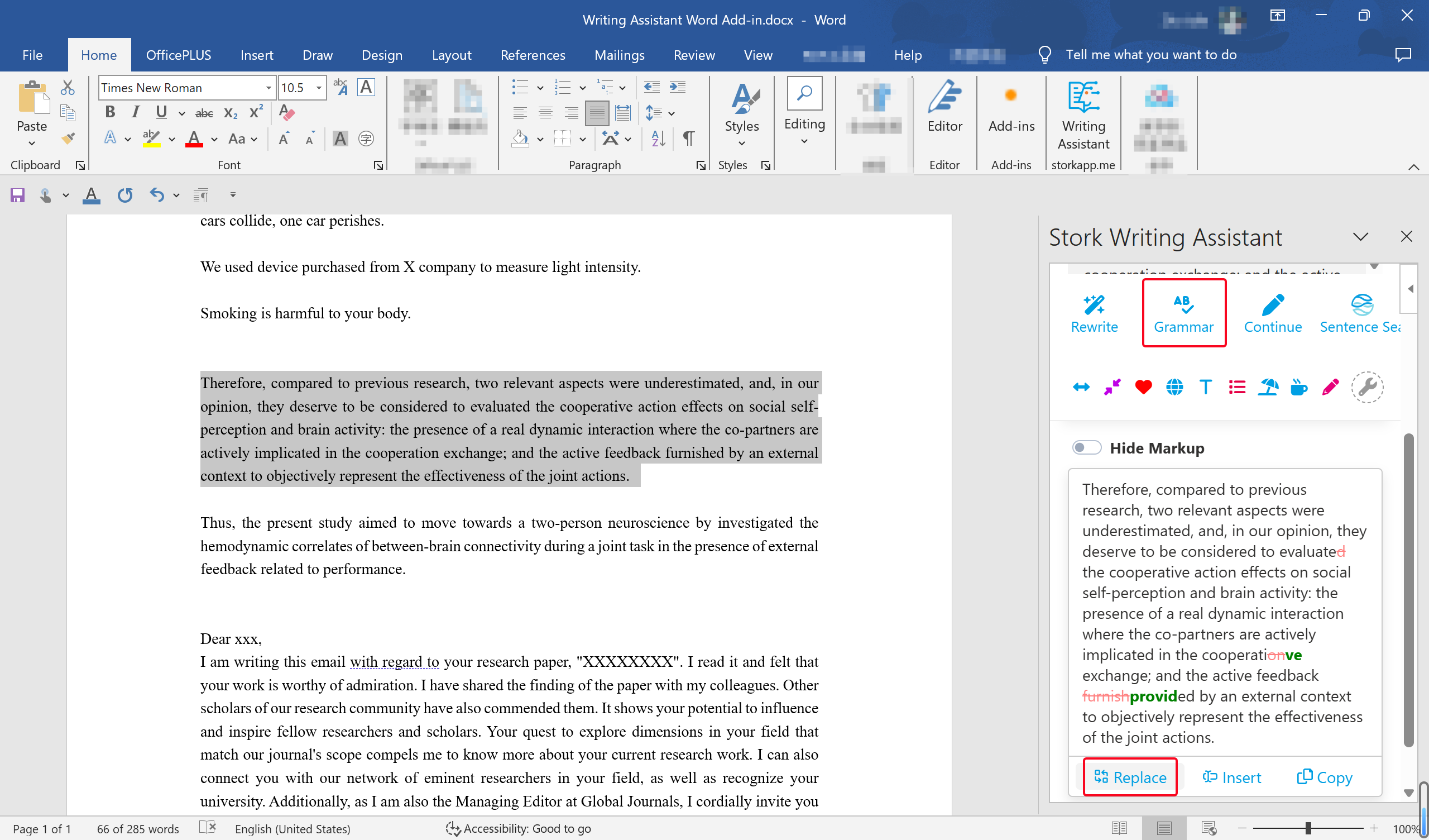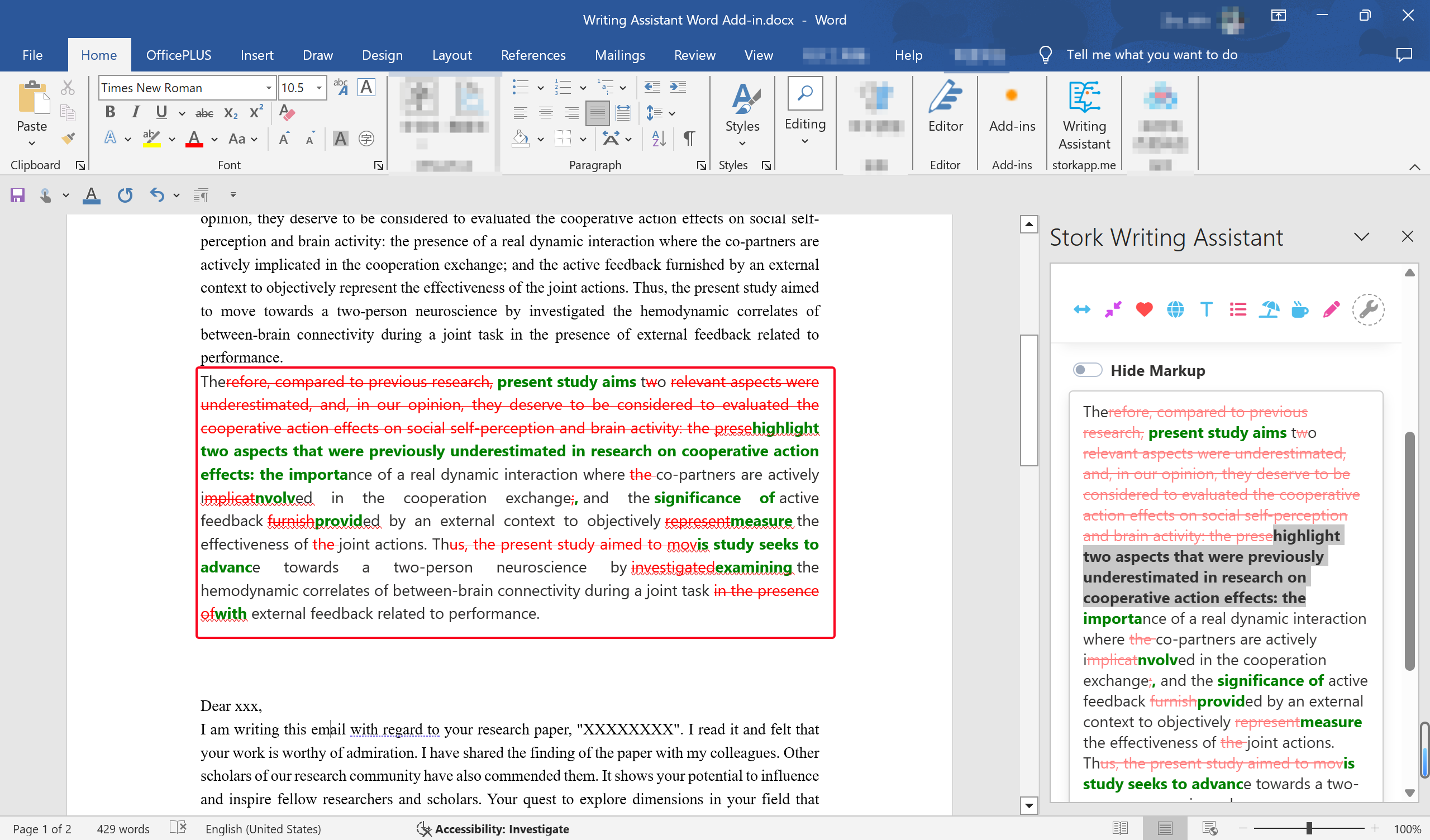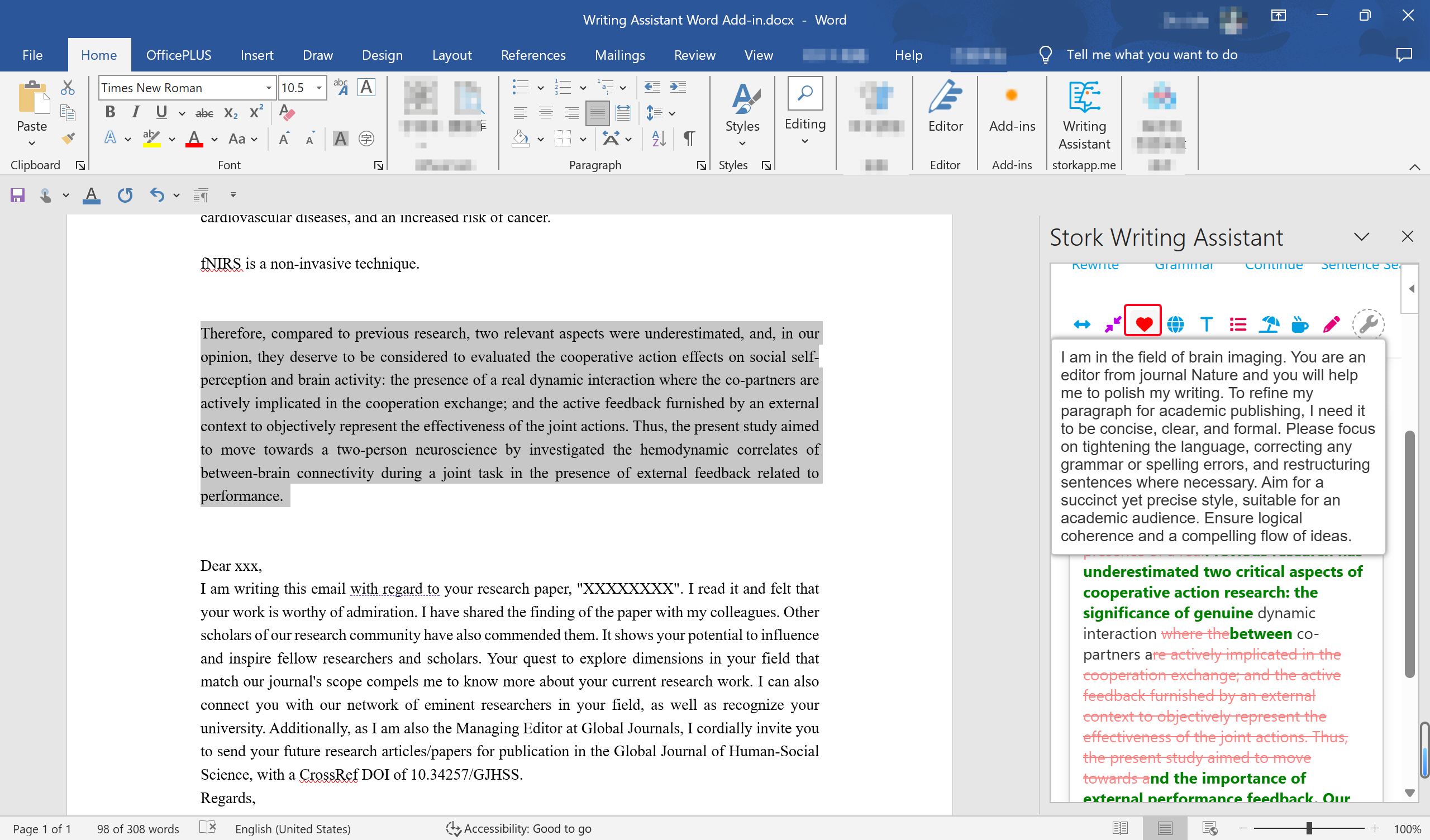 Writing Assistant offers a Word add-in and you can polish your manuscripts directly inside Word. Over 30 published papers have used Writing Assistant to improve the language.