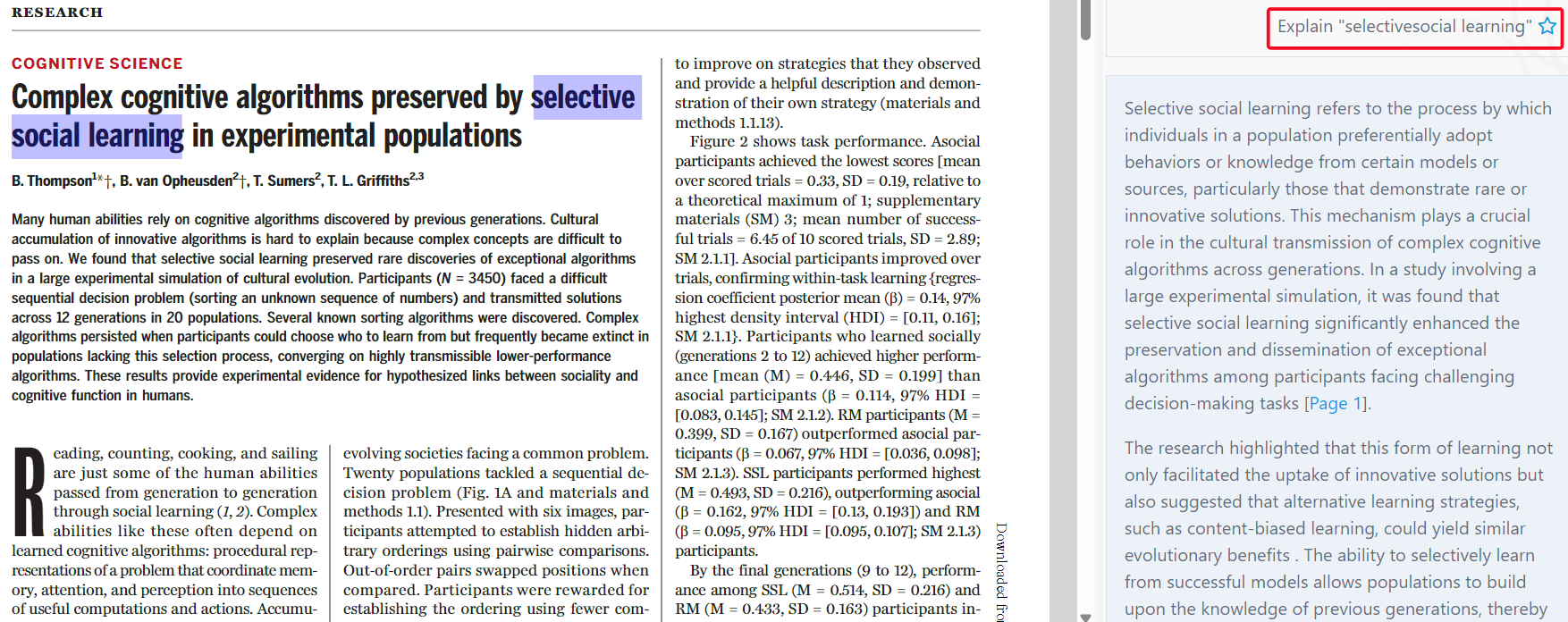 Clicking on any in-text citation will automatically display the corresponding reference details on the right right panel, allowing you to conveniently view information.