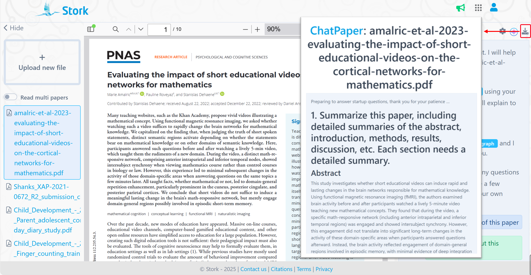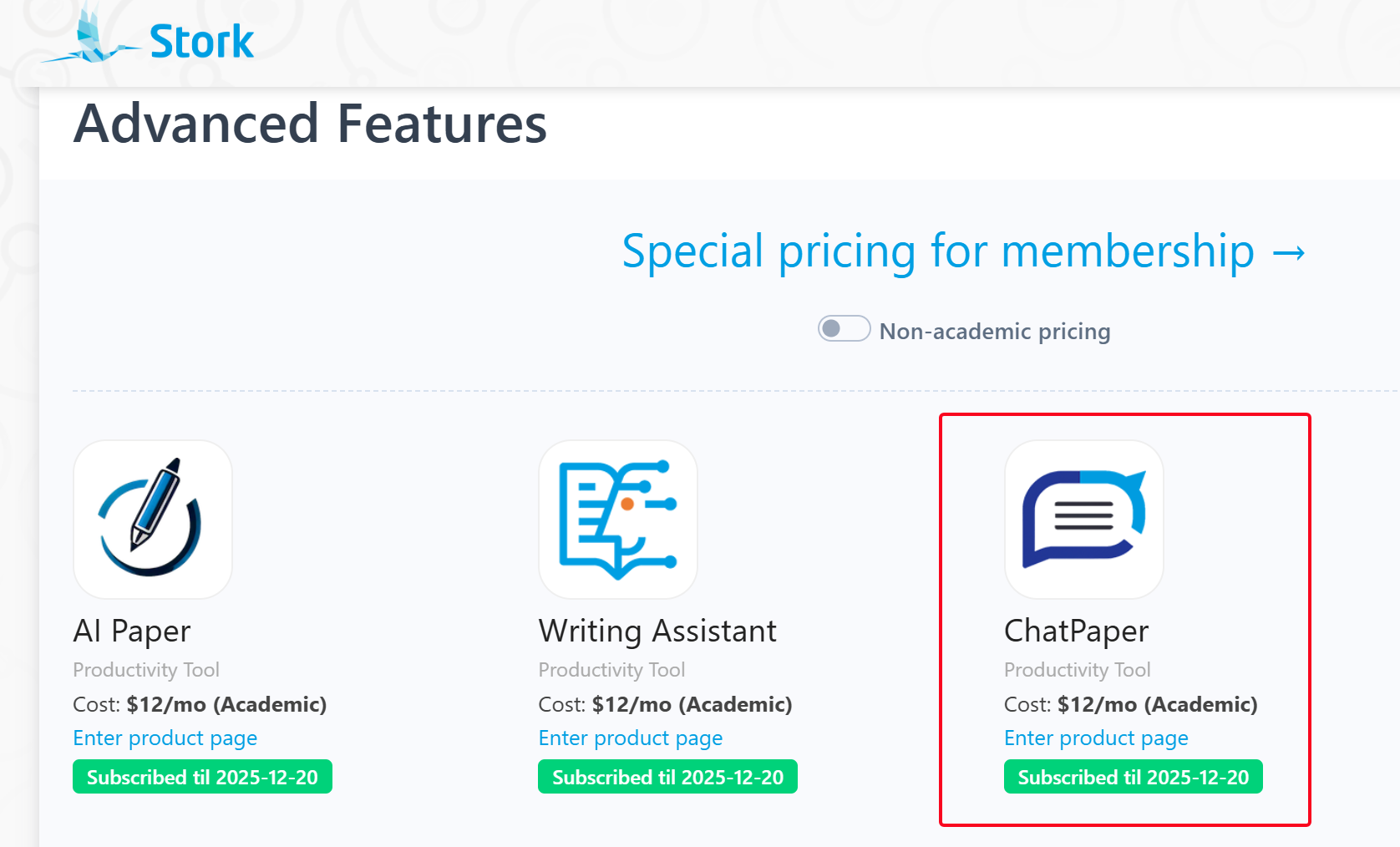 ChatPaper is an advanced feature offered by Stork (free trial is available). After registering/logging into Stork (https://www.storkapp.me), you can find ChatPaper under the "Advanced Feature" section. Then you can try it out or subscribe. Alternatively, you can visit ChatPaper website directly at https://www.storkapp.me/chatpaper/