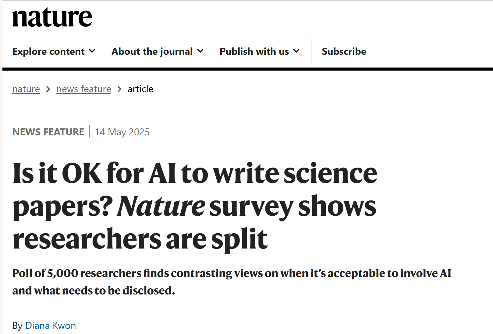 A recent Nature news feature, titled "Is it OK for AI to write science papers? Nature survey shows researchers are split" (https://www.nature.com/articles/d41586-025-01463-8), provides valuable insights. Based on responses from more than 5,000 researchers across disciplines and career stages, the survey explored how AI is being used and what researchers think about it.