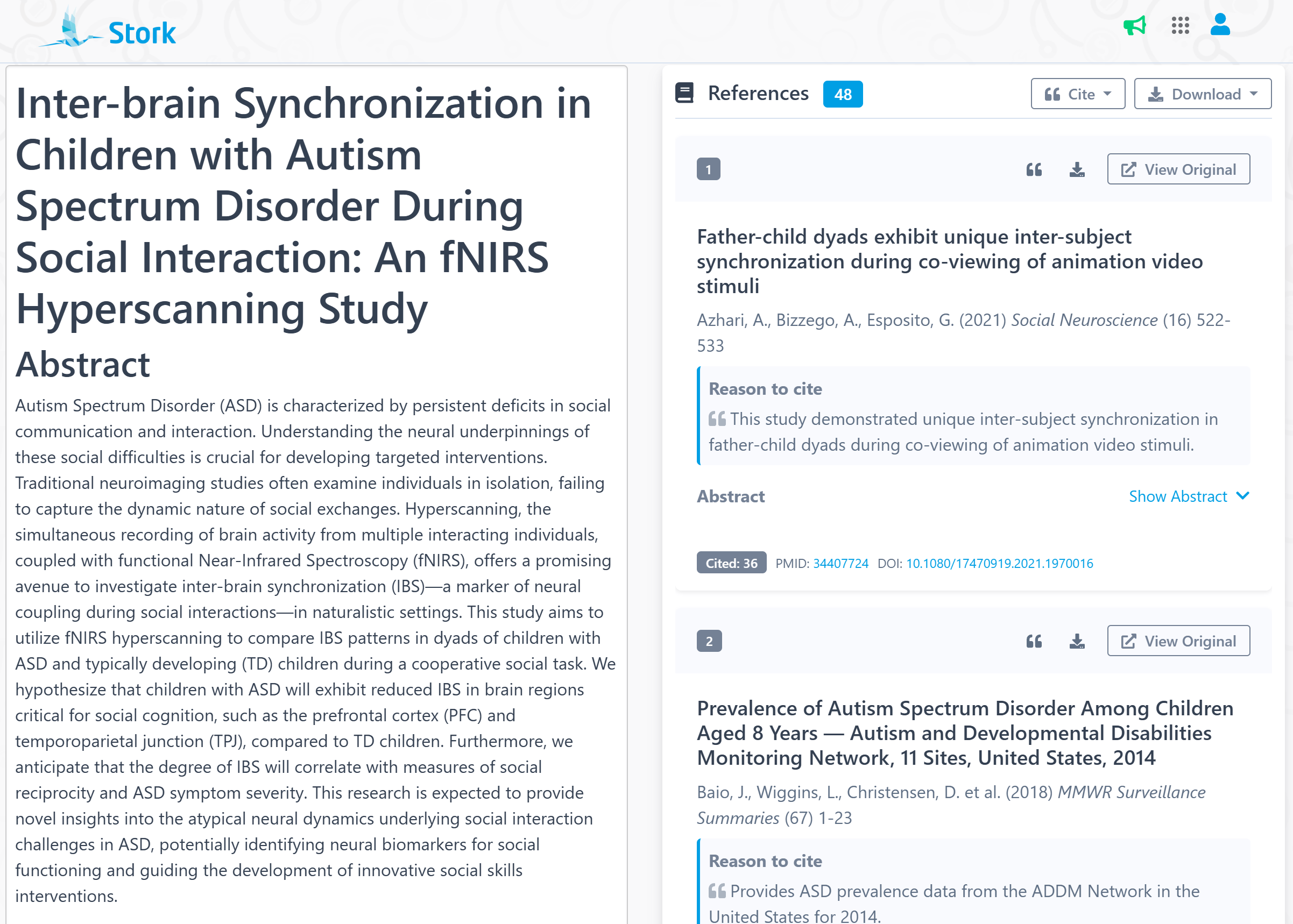 · Reference Search Method: Prefer to input specific references? Stork will locate their full details (like abstracts) and cite them correctly.