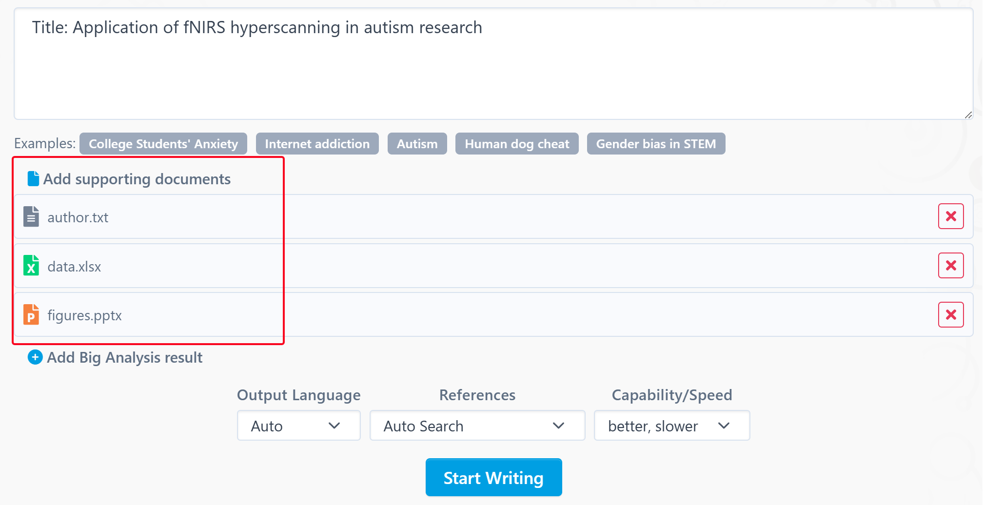To help AI Paper better understand your study, you can now upload up to 5 supporting files. These can include Word drafts, figures from PowerPoint and data from Excel.