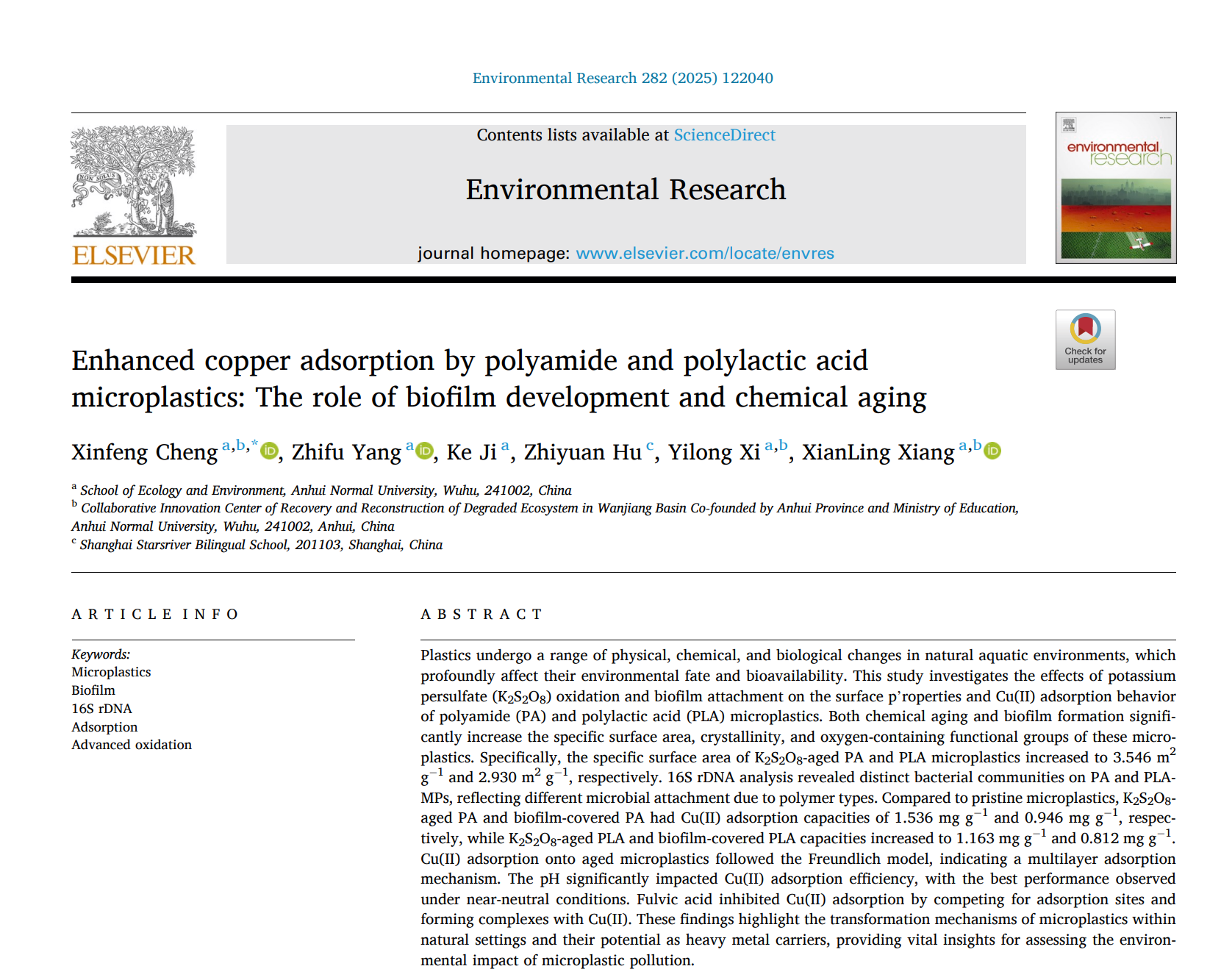 Recently, Xinfeng and his team from School of Ecology and Environment, and Collaborative Innovation Center of Recovery and Reconstruction of Degraded Ecosystem in Wanjiang Basin Co-founded by Anhui Province and Ministry of Education at Anhui Normal University in China published a paper titled " Enhanced copper adsorption by polyamide and polylactic acid microplastics: The role of biofilm development and chemical aging" in the journal Environmental Research (IF = 7.7). The paper cited Writing AssistantBig Analysis, and Citation Network of Stork. You can access the paper here: https://doi.org/10.1016/j.envres.2025.122040